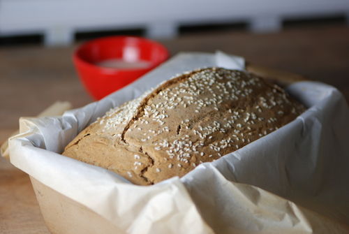 - Смазать маслом 2 формы для выпечки буханок. Можно застелить вощёной бумагой. Выложить в формы тесто. Посыпать кунжутом (если используете). Прикрыть фольгой и выпекать в предварительно нагретой до 180 градусов (350 F) духовке около 40 минут.